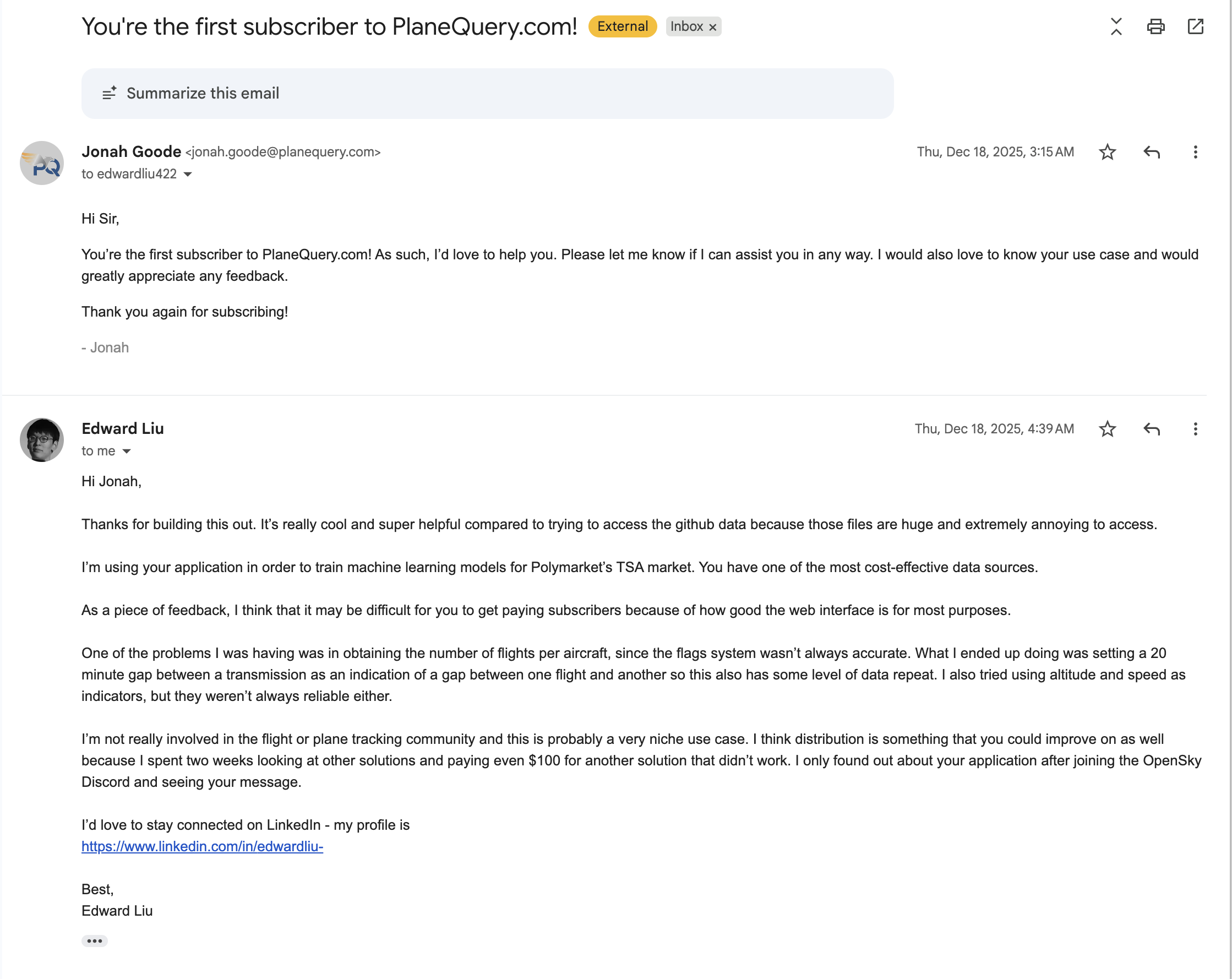 PlaneQuery.com provides a SQL interface to historical plane location data (ADS-B) and aims to be the best platform for aviation data science. What can it be used for? I'll let our first customer ($20/month), who graciously gave me permission to share our communications, explain: